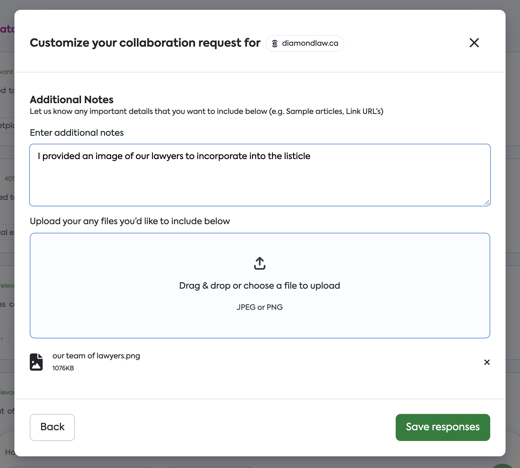 When placing a specific request for a PR piece or link placement, you can now upload brand assets—such as product images, screenshots, or PDF brand guidelines—directly into that specific order.